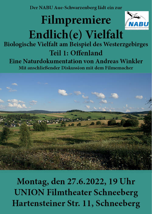 NABU (spolek pro ochranu přírody) Aue-Schwarzenberg představil 27. června v kině ve Schneebergu svůj dokument o přírodě "Konečná mnohovárnost". Film se zabývá stavem přírody v krajině západní části Krušných hor. Je v něm zdůrazněn vztah mezi lidským osídlením a přírodou, což vedlo k významné ztrátě druhů zvířat a rostlin. Film představil krásné obrazy přírody, ale také nás přiměl přemýšlet.