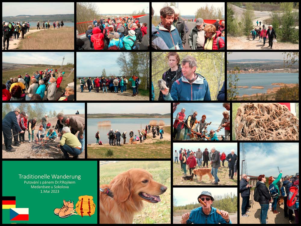 Pak jsme jeli k jezeru Medard, které dříve bývalo také povrchovým dolem. Nyní je v rámci revitalizace plné vody. Na místě, kde byla po dlouhé období vpouštěna voda z řeky Ohře do dolu, nám Petr Rojík vysvětlil geologické vztahy a měl s sebou také pár charakterických geologických nálezů. Někteří účastníci byli zapojeni do rekultivace a vyprávěli nám o ní. Jezero je 3,5 kilometru dlouhé a 1,5 kilometru široké. Díky tomu je největším umělým jezerem v severních Čechách. Poté začala naše exkurze přes rekultivovanou oblast. V polovině cesty jsme si opekli vuřty.