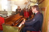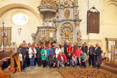 Potom jsme navštívili malou obec Mnichov. Zde byl dříve na několika místech těžen hadec. V místním kostele jsou umístěny sochy a umělecká díla dřívějších obyvatel obce. Obzvláště na nás zapůsobila velká křtitelnice. Petr Rojík byl magicky přitahován varhanami. Spolu s českým přítelem, který šlapal měchy, předvedl Petr malý koncert.