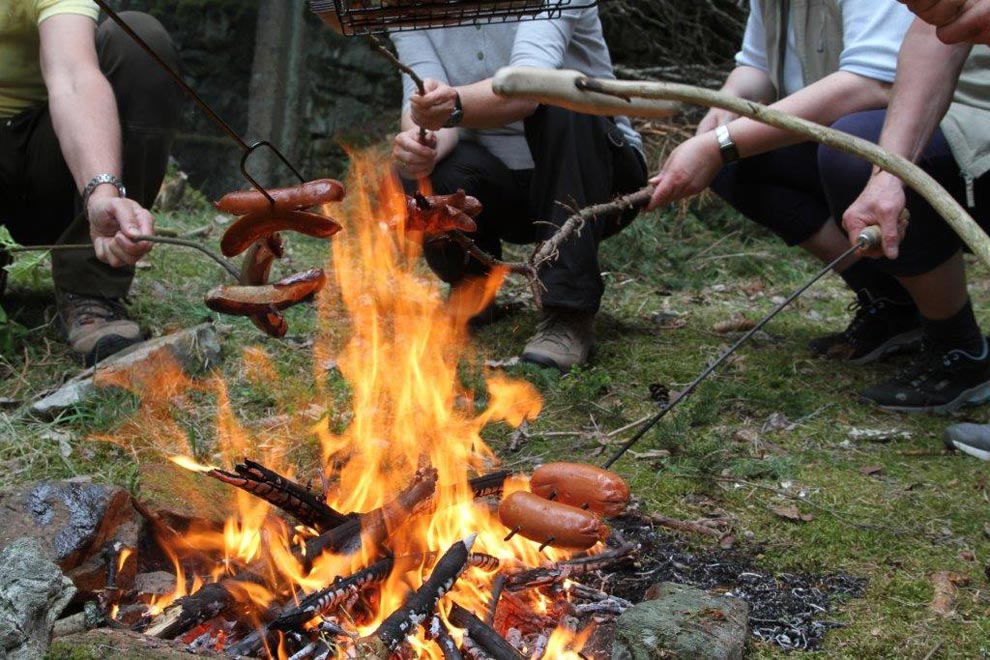Pak už byl čas na oběd. Geolog vždycky ví, kde je dobrý zdroj vody. Zastavili jsme se u pramene s minerální vodou s obsahem hořčíku. Všichni účastníci si naplnili poháry a láhve. Na malém ohni jsme pak společně grilovali české špekáčky a německé klobásy.