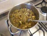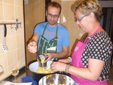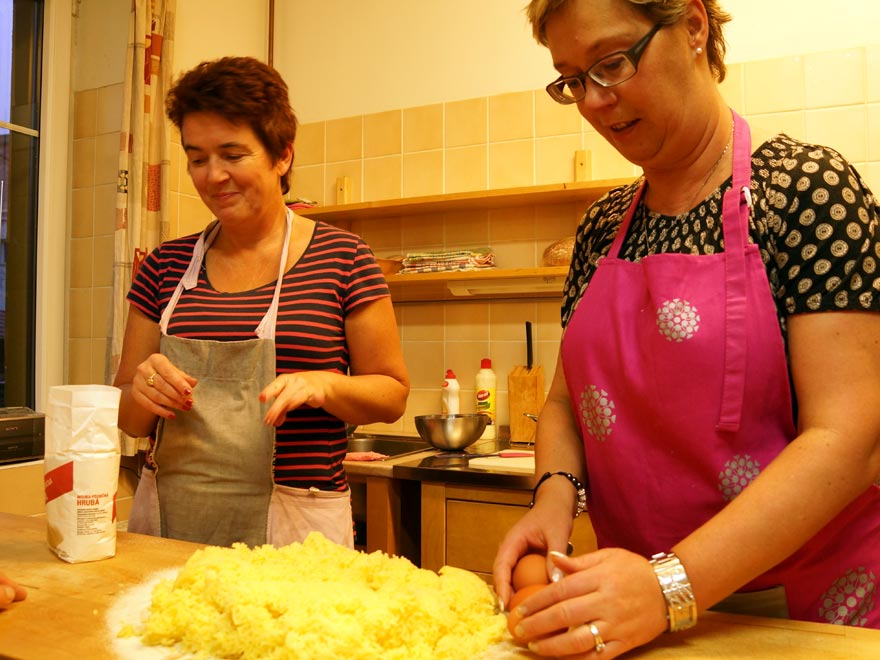 Po bědě jsme konečně začali společně kouzlit menu o čtyřech chodech. Naši čeští přátelé společné vaření skvěle připravili a nás už čekala jen příjemná společná práce. Samozřejmě že jsme si, vedle krájení brambor, klepání masa a samotného vaření mohli najít spoustu příležitostí pro vtipkování a příjemné povídání.