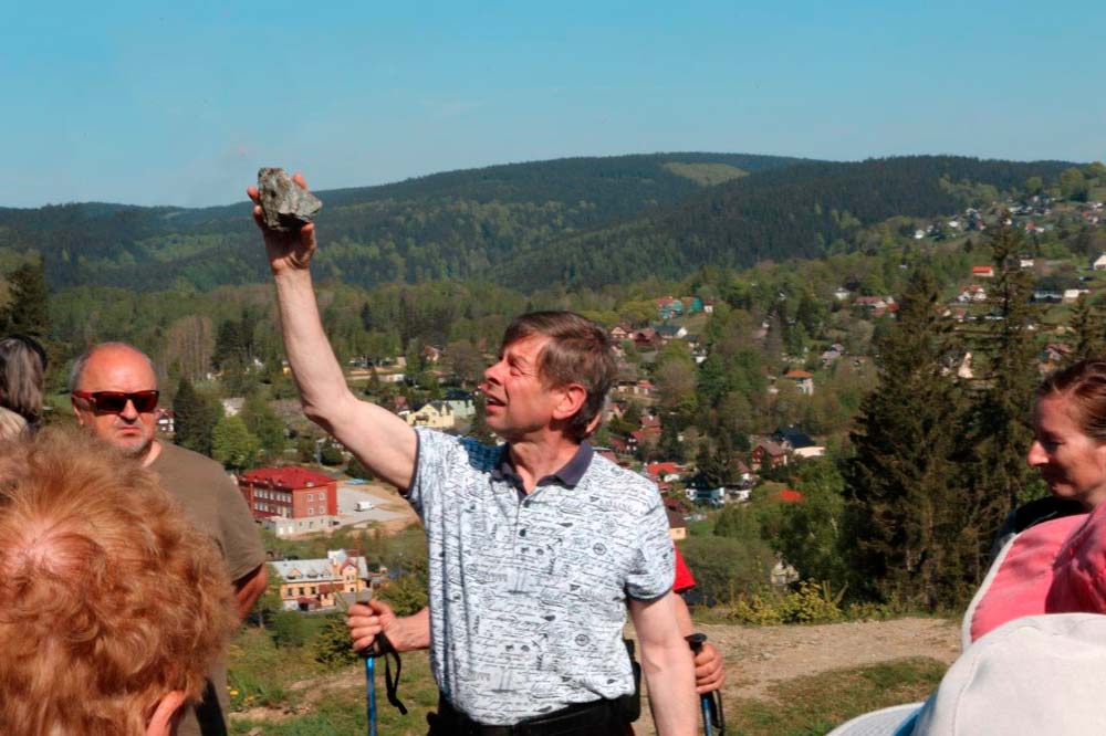 Nachdem wir uns mit unseren tschechischen Freunden am Gemeindeamt in Bublava trafen, ging es per Autokorso hinauf auf den Bleiberg (Olevěny vrch). Dabei begleitete uns die Bürgermeisterin Monika Hrádková. Auf dem Gipfel angekommen, erfuhren wir Interessantes zur Geologie, über den Bergbau vergangener Zeiten und zur gegenwärtigen Situation.