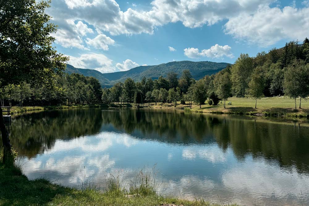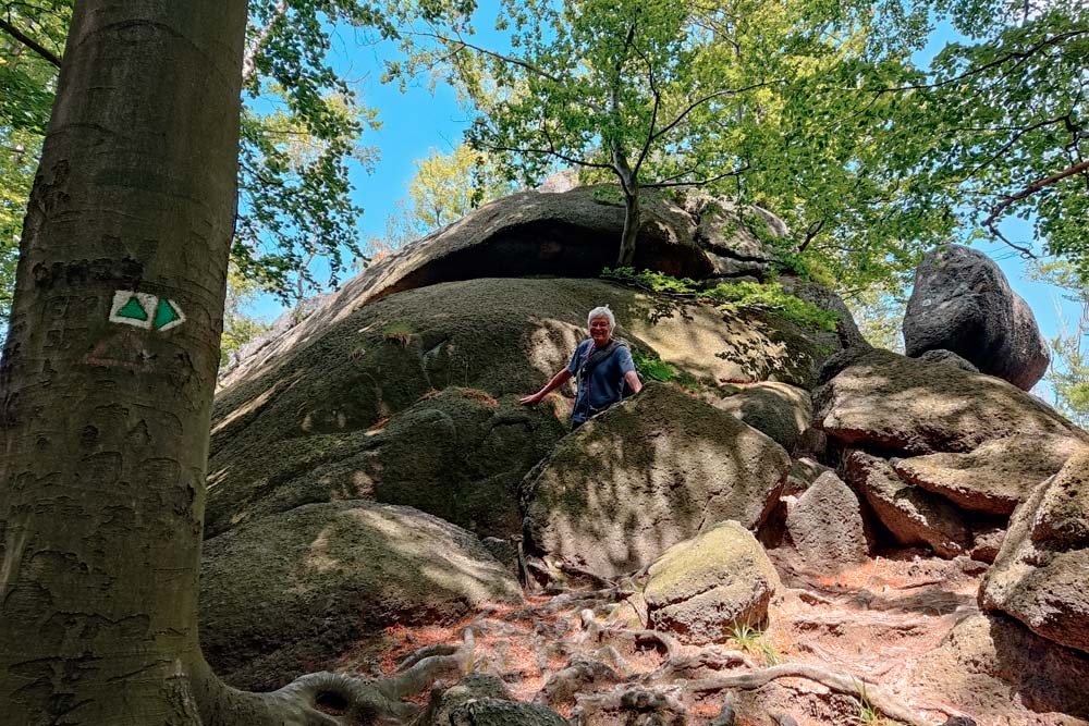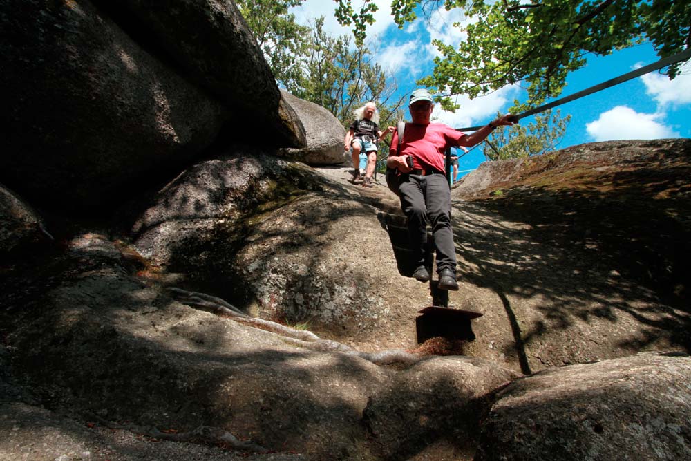 Der harte Kanten – vorbei am Campingplatz Hejnice folgten wir einem sanft ansteigenden Weg ins Schwarzwassertal bis zum Wasserfall. Von dort stiegen die "Sportlichen" einen immer steiler werdenden Weg hinauf zu den Friedländer Zinnen (Frýdlantské cimbuří – 918 m). Wer es geschafft hatte, wurde mit einer traumhaften Aussicht bis ins Zittauer Gebirge belohnt. Einmal oben, führte uns ein romantischer Gebirgspfad einige Kilometer durch Wald und Stein. Über eine ebene Forststraße und einen steil absteigenden steinigen Weg, vorbei an einem idyllischen Waldsee und dem Wasserfall gelangten wir wieder ins Tal nach Hejnice und stärkten uns im Dělnický dům für die letzten Meter zur Pension.