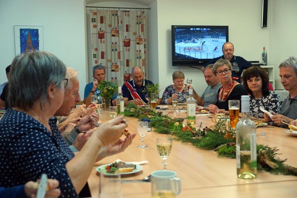 Zum Höherpunkt des Abends wurde ein exzellentes 4-Gänge-Menü serviert, das großen Anklang fand und restlos verzehrt wurde. Unsere tschechischen Gastgeber setzten damit den I-Punkt auf einen sehr gelungenen schönen Tag in Pernink. Danach wurde noch bis tief in die Nacht diskutiert und gefeiert.