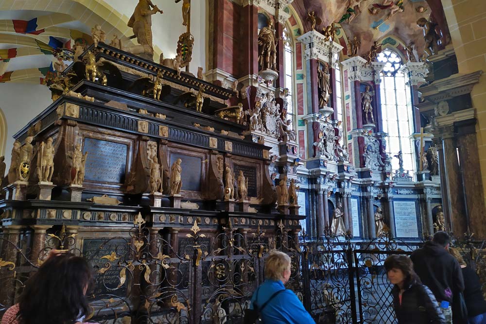 Um 15.00 Uhr waren wir zur Besichtigung in den Freiberger Dom St. Marien eingeladen. Zu Beginn hörten wir zwei Stücke, auf der großen Sibermannorgel. Besonders die Musik von J. S. Bach füllte den Dom mit wunderbaren Klängen aus. Unsere Führerin erklärte uns die wichtigsten Kunstwerke, die Symbolik von Bergmannskanzel und Tulpenkanzel, die reich verzierte Begräbniskapelle, die weltberühmte Goldenen Pforte und den restaurierten Kreuzgang.