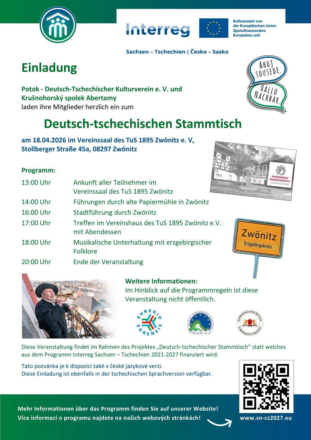Dieses deutsch-tschechische Treffen wird am 18.04.2026 in Zwönitz stattfinden und steht unter dem Motto "Die Geschichte der Industrie im Erzgebirge".
