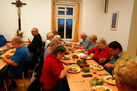 A nyní byl čas začít s vařením. Brambory byly oloupány, králičí stehna, zelenina a knedlíky byly připraveny. Současně s tím byly ve starých přinesených kuchařských knihách hedány tradiční recepty.Učastníci si tak mohli vzít“ sebou domů“ mnoho podnětů a malých triiků pro přípravu pokrmů. Během pečení jsme vyslechli humorný zajímavý přednes o tradiční kuchyni v Krušných horách, který dal velmi dobrý diskusní podklad pro pokračující večer.