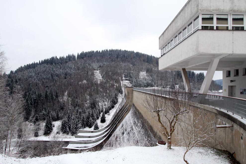 Pak jsme jeli k hrázi největší přehrady v Sasku. Byli jsme uvítáni vedoucím přehrady, který nás seznámil se stavbou a provozem přehrady. Prohlídka přehrady pokračovala ve štole uvnitř betonové hráze přístupné z úpatí hráze. Další dva zaměstnanci přehrady nás provedli a seznámili se zařízeními na odběr vody z nádrže přehrady, která slouží k zásobování měst Zwickau a Chemnitz pitnou vodou.