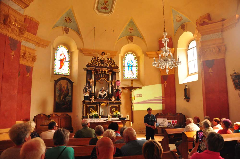 Danach besuchten wir wir in Wartha/Stráž nad Ohří die Kapelle zum Erzengel Michael. In der kleinen Kapelle trafen wir Vertreter der Gemeinde, die uns gemeinsam mit Peter Rojik, historische Details zur Gemeide Krondorf/Korunní (jetzt Ortsteil von Wartha) vermittelten. Insbesondere wurde auf das Buch der ehemaligen Einwohner Anna Ziener und Gernot Hilbert verwiesen (Gedenkbuch Krondorf), welches von Peter ins Tschechische übertragen wurde.