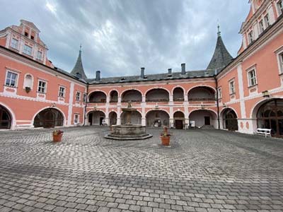 Schon lange bestand der Wunsch einiger Mitglieder unseres Vereines, unseren längjährigen Freund Petr Rojik an seiner neuen Wirkungsstätte im Schloß Sokolov (Falkenau) zu besuchen. So machten sich eine Gruppe von zwölf Mitgliedern und Gästen am 1. Juli 2022 auf den Weg nach Sokolov. Pünktlich um 9.00 Uhr wurden wir von Petr im Schlosshof ganz herzlich empfangen. Zuerst konnten wir die Schatzkammer in den renovierten Kellerräumen unter hohen Sicherheitsbestimmungen besichtigen. Es sind wertvolle Schmuckstücke, die bei den Restaurierungsarbeiten des Schlosses 1993 gefunden wurden. Leider konnten hier keine Fotos geschossen werden.