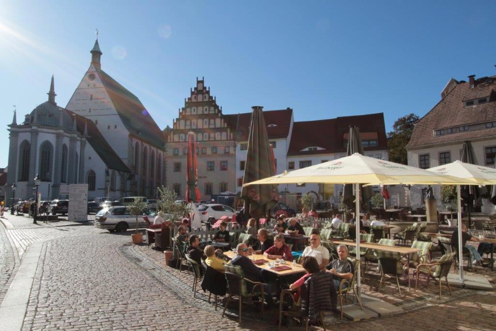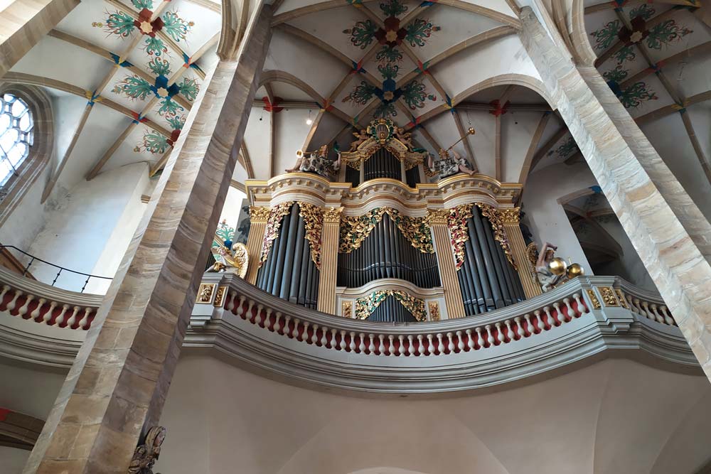 Um 15.00 Uhr waren wir zur Besichtigung in den Freiberger Dom St. Marien eingeladen. Zu Beginn hörten wir zwei Stücke, auf der großen Sibermannorgel. Besonders die Musik von J. S. Bach füllte den Dom mit wunderbaren Klängen aus. Unsere Führerin erklärte uns die wichtigsten Kunstwerke, die Symbolik von Bergmannskanzel und Tulpenkanzel, die reich verzierte Begräbniskapelle, die weltberühmte Goldenen Pforte und den restaurierten Kreuzgang.